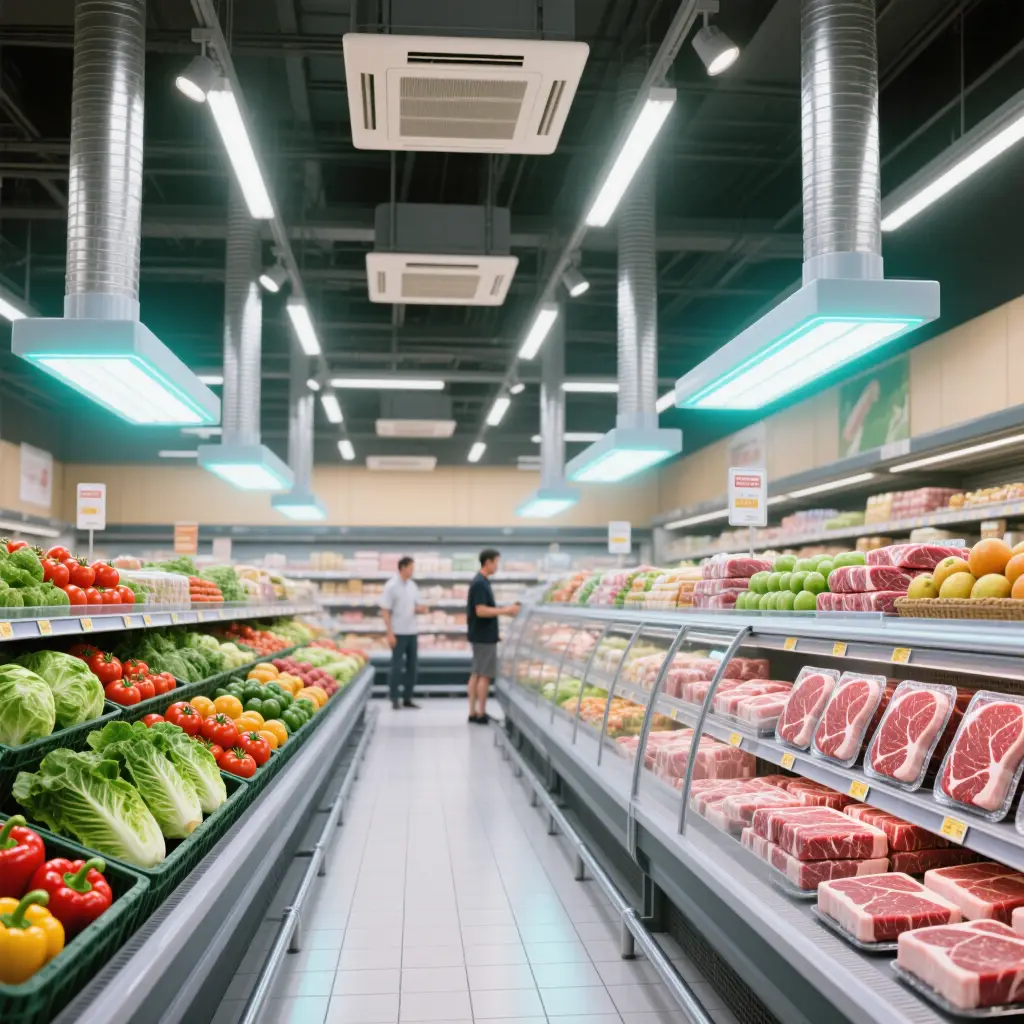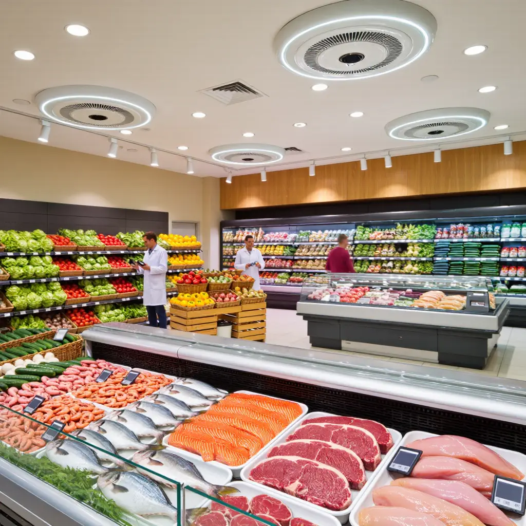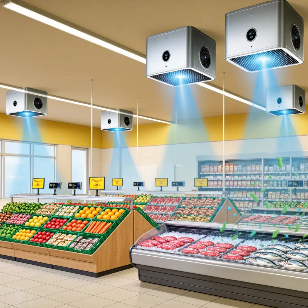 Supermarkets struggle with maintaining freshness, odor control, and food safety. Conventional refrigeration and chemical cleaning often fail to prevent microbial growth or unpleasant odors in produce and meat sections.