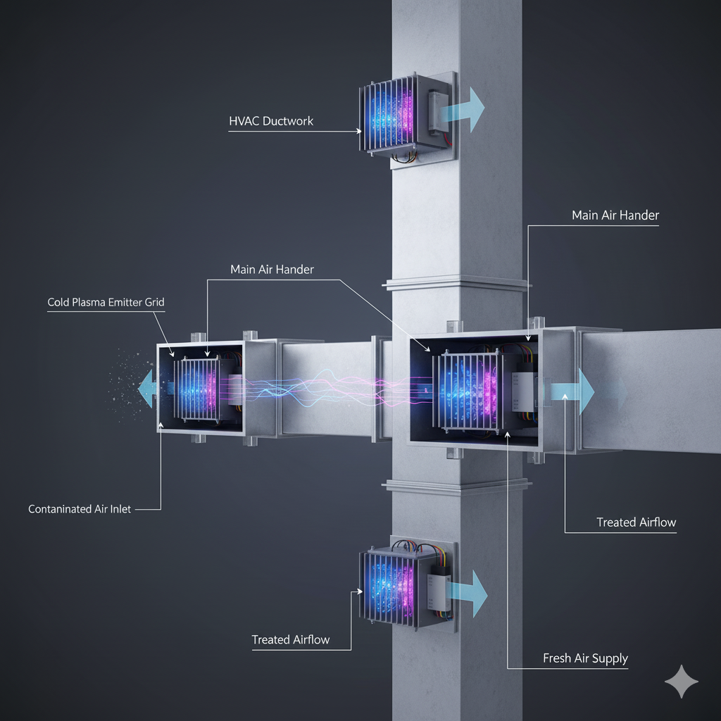 Cold Plasma reactors are integrated directly into HVAC ducts, air handlers, and ventilation systems.