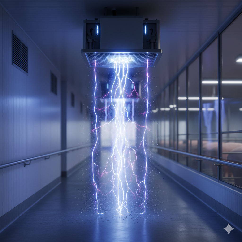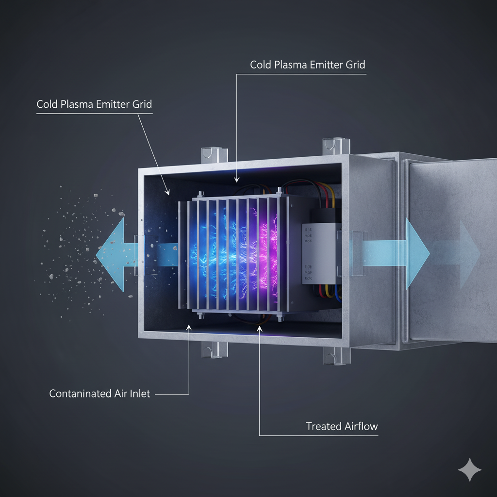 Cold Plasma works through non-thermal ionization, producing reactive species (ROS and RNS) that inactivate bacteria, viruses, and fungi in real time.